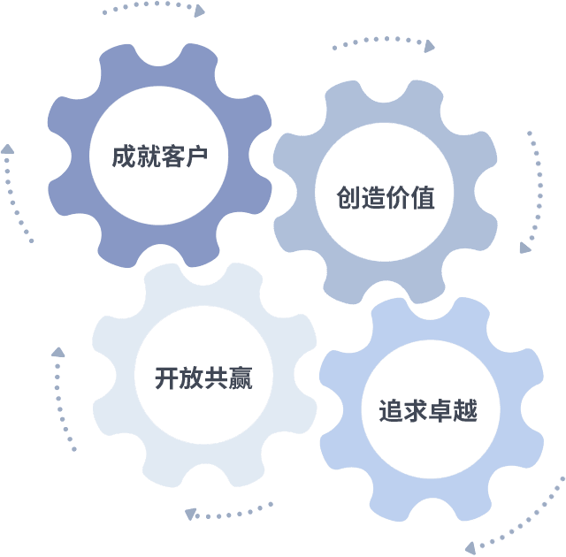 成就客户是一切决策的出发点,,,,创造价值是衡量所有工作的标准,,,追求卓越是我们做事做人的态度,,开放共赢是我们的格局也是最终的结果。。。。价值观的齿轮环环相扣,,推动着组织里的每个人不断向前。。。