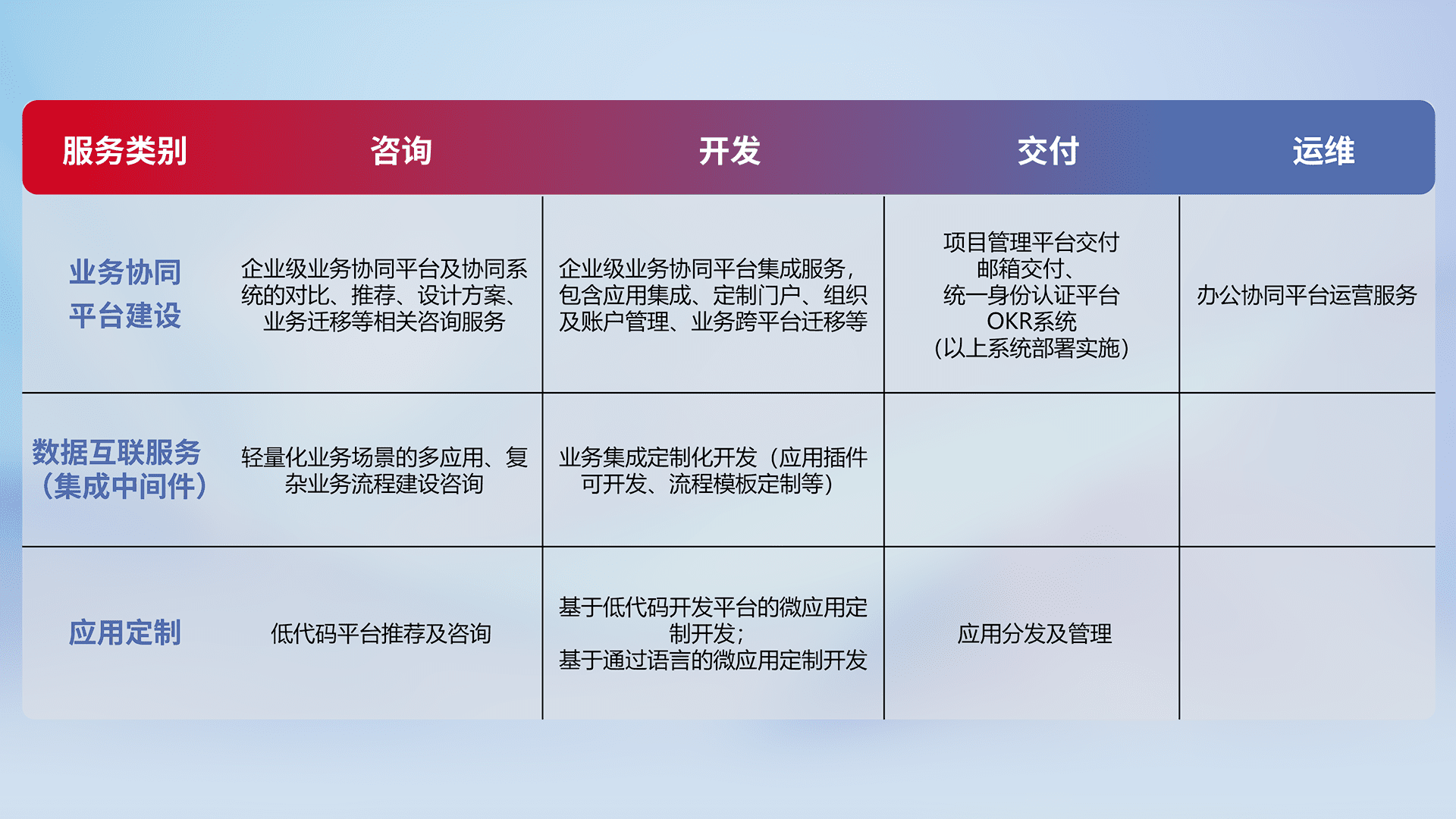 针对钉钉、、企微、、IDaas等平台级产品提供产品的规划、、、方案、、、、交付、、、定制化开发等服务,,,,实现如统一协同办公、、、、智能客户服务、、、、混合会议管理、、、智能数据查询、、等业务场景,,,实现数字化转型。。。。