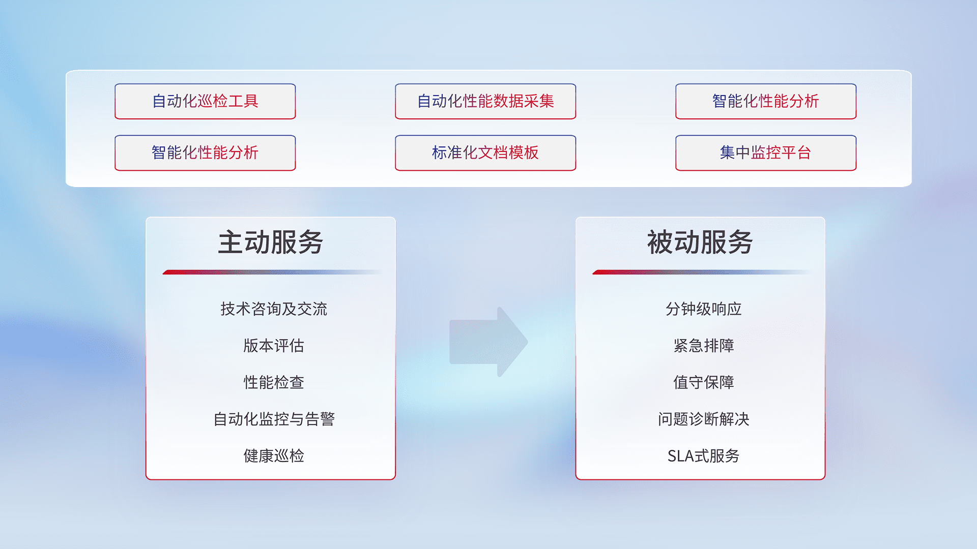 智能化工具和标准化文档,,,保障服务质量,,,提供主动服务(包含技术咨询、、、、版本评估、、、、性能检查、、、自动化监控与告警、、、、健康巡检)和被动服务包含(分钟级响应、、、紧急排障、、、值守保障、、、问题诊断解决、、SLA服务)。。。。